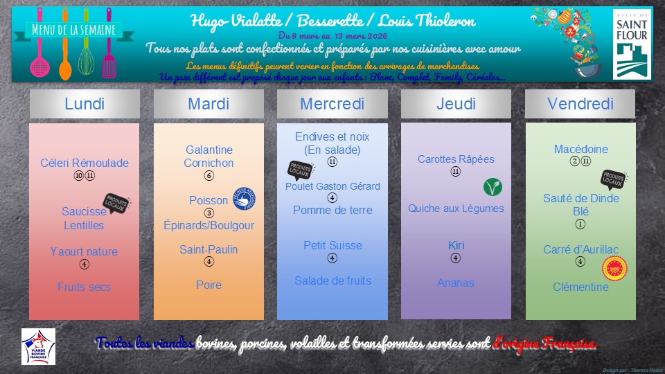 Menu des cantines scolaires du 9 mars au 13 mars 2026